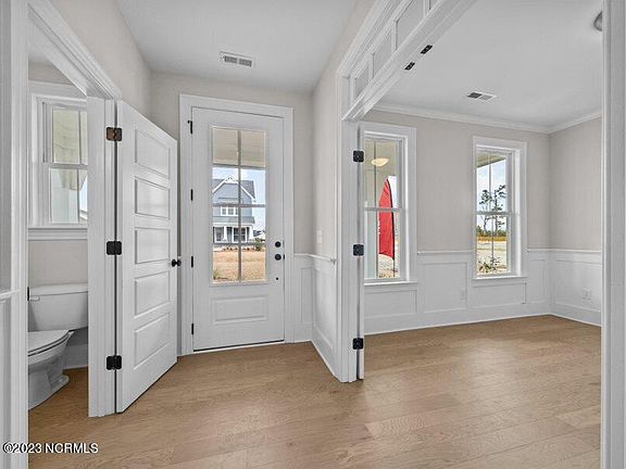 The Highland Modern Farmhouse by Robuck Homes showcases clean coastal style with thoughtfully planned spaces, including a first-floor primary suite, large office, expansive kitchen and 3 additional bedrooms plus two bathrooms on the second floor. This home boasts many designer features and is situated on a prime homesite in the Summerwyck Collection of Wyndwater.