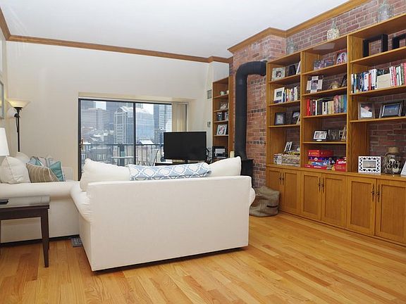 Fabulous views from this south side two bedroom plus den condo PENTHOUSE Exposed brick,hardwood floors built-in bookcases, two baths, two wood burning stoves, and TWO DECKS make this a must have home. There are 95 residential units on 4 floors and 41 commercial units on the first two floors. This high-end building has 24-hour security, two elevators, laundry room, and swimming pool. Just a few blocks away from Quincy Market, the New England Aquarium, at the historic North End.