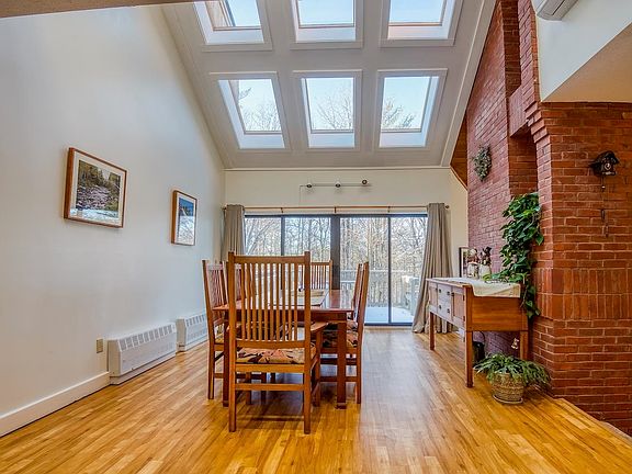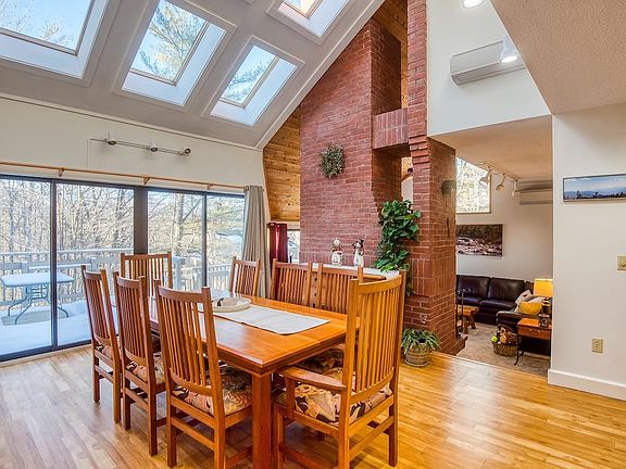 THERE IS NO BETTER SETTING--LESS THAN A MINUTE TO MOUNT CRANMORE and just a little further to North Conway Village, this 3,500+ square foot end unit offers abundant natural light and three levels of living space. Architecturally appealing design with six bedrooms and four baths, this unit is one of the largest in the valley. The main level hosts a cook's kitchen with beautiful wood cabinets and granite countertops. The sunken living area features a massive raised hearth, brick fireplace with efficient woodstove insert, and direct access to the deck. Stunning sky-lit dining area backs up to the floor-to-ceiling brick hearth and opens onto the deck, as well. A practical main level bedroom and bath and a generous mudroom entry round out the main level. A white cedar-lined silo stairway leads to the barrel vault lit upper level with primary bedroom and bath and additional two bedrooms with shared bath. Room to expand into the daylight lower level with two additional bedrooms and bath, a storage/utility area, and a large family room with cozy gas woodstove and walkout access to a concrete patio. This unit has numerous updates including wall-mounted heat pumps that serve to keep the unit cool in summer and warm in the shoulder seasons. Association pool and tennis available. These are truly amazing units like no other in the valley. Note: association limits rentals to 30 days or more and is located in the Kearsage Lighting Precinct.