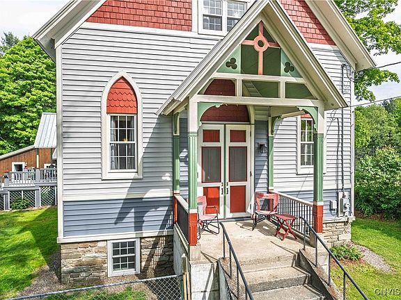 Step into a truly unique residence where timeless architecture meets modern luxury. This breathtaking home, once a historic church, has been meticulously transformed into a one of a kind living space, that seemlessly blends original character with contemporary comfort. Towering vaulted ceilings, majestic arched windows, original front door and hardwood floors, timber screw enforced wooden beams, and stonework preserves the buildings sacred past, while the new updates and amentities introduce a new chapter of elegant living. The main 3 bed, 2 bath home features first floor laundry with brand new washer and dryer, a triangular kitchen with stainless steel appliances, a large island and plenty of cabinet space, a huge walk-in pantry and a living room/dining room combo. The massive lofted primary suite offers a spa like en suite bathroom and walk in closet, cathedral ceilings and large arched picture windows. The full, walkout basement has been completely sealed and is extremely dry. There is a tiered deck overlooking a partially fenced yard and a large garage with a workshop and second story for storage. The other side of the garage has been made into an additional living area. The "Church Pool Lodge" is a fully functioning short term rental business, but can be used as a fully furnished guest house. With an additional 1350 SQFT of furnished living space, the lodge has all of it's own appliances and utilities including septic system. Located near the snowmobile/ATV trails and walking distance to the famous Salmon River fishing spots, this unique home truly has so much to offer! Tax records do not reflect the finished upper level, making it 2650 SQFT.