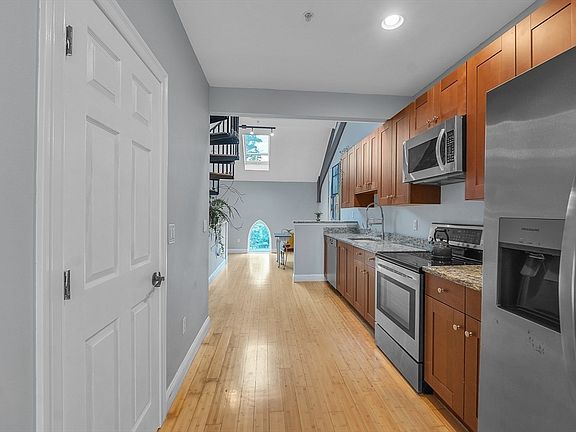 Modern efficiency meets historic charm. This three-level condo in the converted St. Mary’s Church blends stunning architecture with upgrades completed in 2022. Featuring 2 bedrooms, 2 full bathrooms, and a loft on the third level ideal for an office, guest room, or flex space, this home is move-in ready.Upgrades include a brand-new ultra-efficient hybrid heat pump system providing both heating and cooling, a brand-new ultra-efficient hybrid heat pump water heater, and a brand-new in-unit washer & dryer. Both bathrooms feature updated vanities and storage, closets were redesigned for better organization, and luxury vinyl plank flooring was added in both bedrooms. Phillips Hue smart lighting was installed throughout for style and convenience.Original arched windows, soaring ceilings, and exposed woodwork showcase the building’s history, while modern finishes and efficient systems deliver comfort. The unit has 2 parking spaces, one deeded and one permitted, plus guest parking.