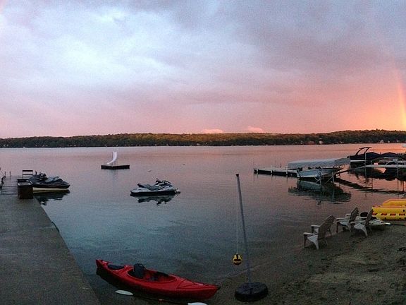 Bantam Lake Direct Waterfront 3BR/1B Year'round Ranch with panoramic lake views and it's own sandy beach-perfectly set for fabulous sunrises, spectacular moon rises and rainbows too! During any season or time of day or night, treat yourself to nature's most picturesque and enjoyable moments. Relish expansive lake views from this home with open floor plan, wood burning fireplace, kitchen with granite counter tops and central AC. Outdoors, choose to bask in the sun from either the deck or on the terrace at the water's edge, or hop in the hot tub. Great value in this home since many new & pricey items have been replaced around 2012: heating/tankless hot water propane system, windows, 30 year architectural roof shingles and tasteful choice in siding. Comes equipt with a wooden dock that extends from the cement dock. Bantam Lake is CT's largest natural lake offering both summer and winter sports: swimming, water skiing, boating, fishing, ice skating, and more!
