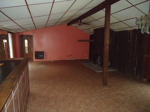 Exterior Features:Exterior is in overall pretty decent shape with vinyl siding and an asphalt roof. Small side porch. Windows are in tact. Interior Features:Single story home with two bedrooms and one bath. The living room is in fair condition with a ceramic tile floor, a bar, and a functional fireplace. The kitchen is complete but dated and is in fair condition with a carpeted floor. Full bath is complete but dated with a vinyl floor and is in overall poor condition. There is also a washer and dryer present along with an electrical panel, hot water tank, and furnace.