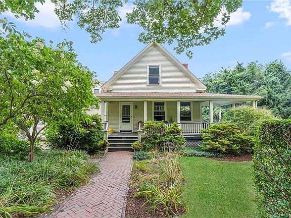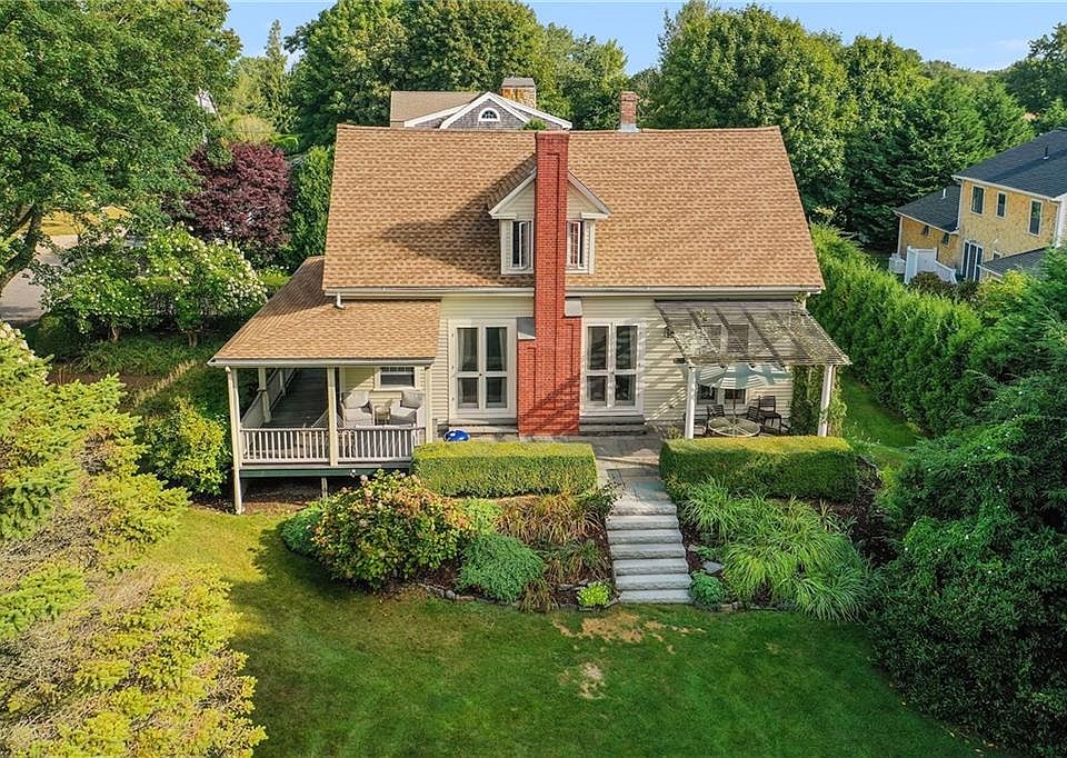 A classic Jamestown farmhouse loaded with charm- a renovation and addition provide an abundance of natural light and a more open feel. A wrap-around porch opens to a bluestone terrace with granite steps down through terraced flower beds, to an expansive yard, enclosed by a privet hedge - perfect for play and privacy. The living room, with heart pine floors, has a wood-burning fireplace flanked by French doors that open to the terrace and yard beyond. Off the living room is a custom-designed office with tiger maple bookshelves and pocket doors that provide a private workspace.The kitchen is well organized with custom cabinets and granite counters and opens to the dining area. The dining area also has French doors that lead to the terrace. A powder room is well located off the laundry room/mudroom area; there is a back staircase from there to the second floor.The owners' bedroom is at the north side of the house with a lovely bath that has a separate shower and soaking tub. Private sitting area, off owners' bedroom area. Two additional bedrooms and bath at south end of the house where there is a sitting area between the rooms that provides for multiple uses. The garage is an over-sized 2 car with room for a workshop and additional car parking or storage. A private outdoor shower completes the picture. Sale subject to lease that extends to 6/25/21. An absolutely charming home on a quiet tree-lined street; village location near golf course and close to waterfront.