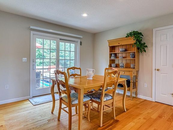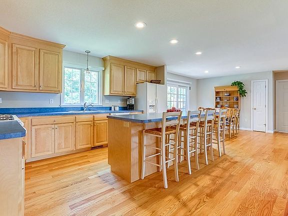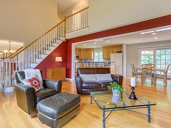 Sought after Great Woods neighborhood. This Cape style home has a wonderful open floor plan. Living room with cathedral ceilings, recessed lights, hard wood floor, a two story brick fireplace, rustic wood mantle opens to the spacious eat in kitchen. First floor master bedroom offers private bathroom with shower & tub as well as nice sized walk in closet. Kitchen has a center island with breakfast bar, maple cabinets, pantry closet and hardwood floor. Formal dining room has hard wood floor,chair rail, crown molding & sunset views. Second floor has three spacious bedrooms each with ample closet space, plus a convenient office nook. Marvelous finished basement adds family room, game room and exercise space. There is a first floor laundry room plus coat closet, storage & mud room. Garage is insulated. Sliding doors in the kitchen lead to a deck and blue stone patio which overlooks the tree lined back yard with plenty of room for play. Yard extends approx 40 feet (APO) into woods.