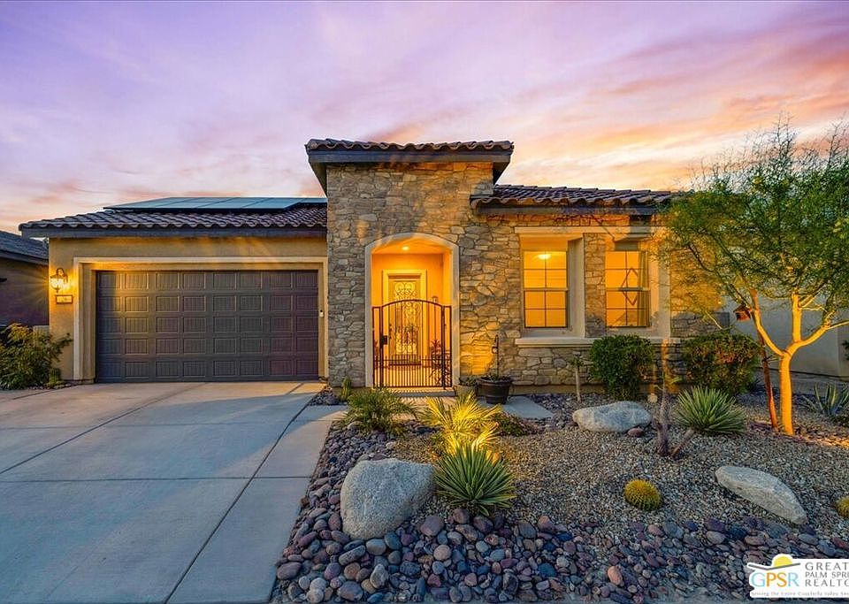 Welcome to resort-style living in the prestigious 55+ community of Del Webb Rancho Mirage. This highly sought-after Phase 6, Plan 6 Tuscan-style PRESERVE floorplan offers 2 bedrooms, 2 bathrooms, plus a versatile den/media room -perfect for work or relaxation. Enjoy the benefits of OWNED solar and an open-concept design featuring a bright, airy color palette, custom accent walls, and beautiful tile flooring throughout. The custom entryway sets the tone with elegant wrought iron gates and an upgraded glass-inset front door, combining both security and natural light. The gourmet kitchen is a true centerpiece, boasting 42" upper cabinets, quartz countertops, a full designer backsplash, Whirlpool appliance package, and an oversized island with plenty of seatingideal for entertaining. Retreat to the spacious primary suite with a luxurious ensuite bath featuring dual vanities, a large walk-in shower with bench, a generous walk-in closet, and a linen closet for extra storage. The secondary bedroom is thoughtfully positioned near the front of the home, offering privacy and convenience for your guests. Step outside to your private backyard oasis complete with covered lounge and dining areas, ambient lighting, custom landscaping, a tranquil fountain, and citrus trees including lemon and tangerine (permitted for an above ground hot tub!). Additional upgrades include a whole-house water conditioning system, a tech package with speaker pre-wiring, 220v pre-wire in garage, and custom window treatments throughout. As a resident of Del Webb, you'll enjoy access to a world-class clubhouse featuring a bar, lounge, billiards, resort-style pool and spa, fitness center, tennis, pickleball, and more. Come discover the lifestyle you've been waiting for!