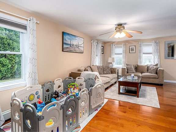 Beautifully updated cape- style home w/ extensive improvements inside out. Gorgeous kitchen w/granite counters, tile back splash, over-sized granite island w/extra cabinets for tons of storage, desk/workstation. Expansive living room with wood flooring and pellet stove pallet of pellets included.Slider off kitchen goes out to over-sized composite deck w/vinyl railings with plumbed gas grill and yard with fire pit and shed. First floor master bedroom addition features vaulted ceiling, master bath w/maple cabinets, double sink, with sliders out to the expansive deck. Two additional large bedroom and full bath on second floor. Additional finished space in lower-level features area as playroom and/or exercise room. Exceptional economical solar program. Please view floorplan in photos. Nicely landscaped in a neighborhood location too.