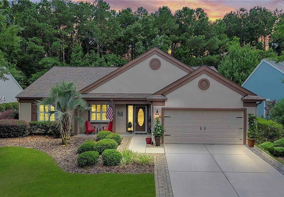 Located in the Hilton Head Sun City community, is this stunning 2BD/2BA+Den Dogwood model w/a private wooded backyard. The gourmet kitchen includes custom cabinets, granite countertops, newer ss appliances, double oven & under cabinet lighting. Other upgrades include LVP flooring throughout (carpet in GBR), 23'x20' Carolina room, bay windows in the kitchen and primary bedroom, laundry room w/extra cabinets & countertops, covered front porch, back patio w/pavers, new roof (2020) & new ext. paint (2022). The garage includes walk-up stairs to attic storage, epoxy floors & utility sink. Too many upgrades to list, this home is a must see!