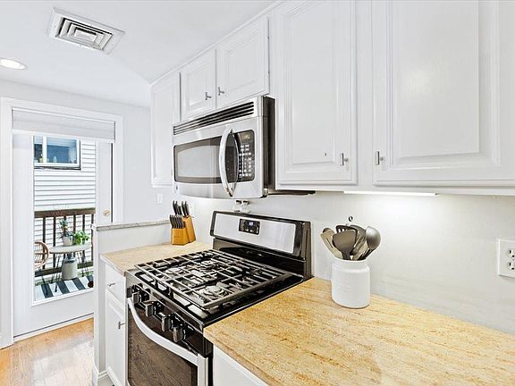 Rare to market, this 2 bed, 2 bath home w/ deeded parking is a short walk to Monument Square & lives like a much larger home! This ideal layout offers a stylish kitchen open to dining & living, granite breakfast bar that seats 2, custom tiled backsplash, stainless appliances, warm hardwood flooring & private deck. Spacious dining area is well placed - ideal for entertaining. Living area boasts gas fireplace adorned with a white wood mantle, custom built -ins, hardwood flooring & 2 windows. Master suite features custom closet, hardwood, en-suite bath w/newly installed white vanity with carrera marble top & tile flooring. Oversized, second bedroom currently used as den, has custom closet, hardwood flooring & fireplace w/white wood mantle. Additional room, in use as nursery, sets home apart. Central A/C, basement storage, & in-unit laundry complete this ideal home!