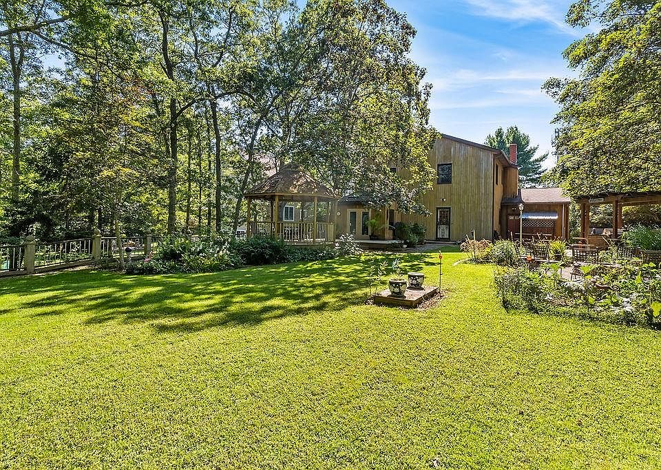 Welcome to this wonderful family home. Situated on a wooded 1.25 acre lot, it is close to everything but yet still feels like it is a private retreat. This home is ideal for entertaining both inside and out. The first floor has an open layout kitchen with a large granite island, a living room, 1/2 bath, family room, formal dining and a huge sun room. The second floor has 4 beds and 2 baths plus a sitting area. Outside you will find several mature plantings that help keep the property private and serene. In the back, upper yard you will find a deck and gazebo, fire pit area and an outdoor kitchen complete with a wood fired pizza oven. In the lower yard there is a man-cave/ she-shed with a screened in porch outdoor sitting area and a fire-pit. There is also a 4 hole mini-golf course. Last but not least, there is a large workshop ideal for woodworking or other crafts.