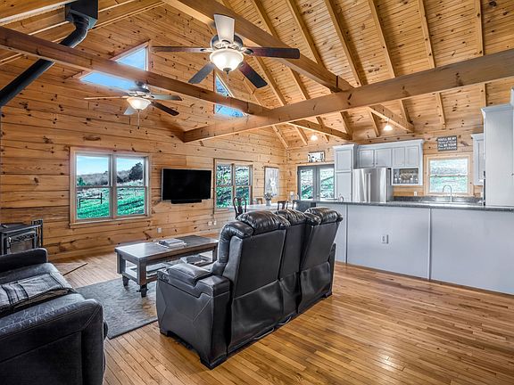 Beautiful log cabin sitting on 21.35 acres. All the sheet rock walls have been freshly painted in light neutral color. Kitchen has been completely updated with quartz countertops and high end stainless steel kitchen aide appliances (less than 1 year old). Brand new 16 seer Trane air conditioner with electronic filtration. Fiber optic internet and TV onsite. Property is completely fenced and cross fenced for horses and cattle. There is a 30x40 Shop. Beautiful hillside views!