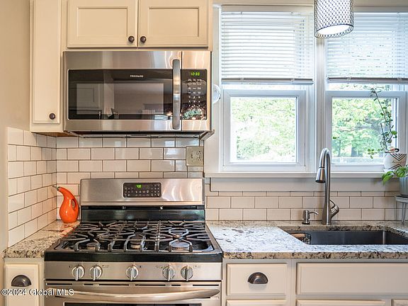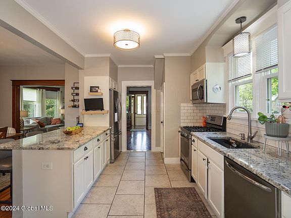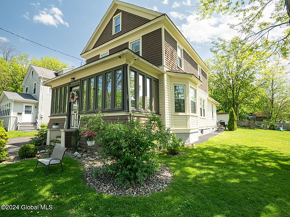 Sitting on a double lot in the heart of East Greenbush is this 2 story home w/full front porch to use year round. Many updates including the new kitchen with granite countertops, stainless appliances, pantry and bar area that seats 3. The wall between kitchen & dining room has been opened up creating a fantastic flow for entertaining or family use.Extra room on first floor currently used as playroom, could be a great office or bedroom-has a closet. Mudrm/laundry rm too. Upstairs boasts 3 bedrooms & full updated bath. 3rd floor is the largest of the 4 bedrooms! Windows have all been updated along with gas furnace.