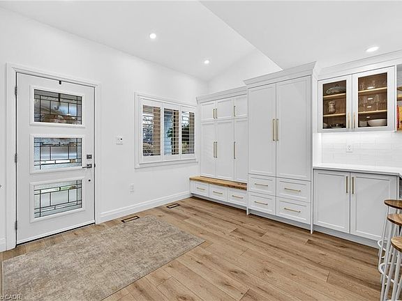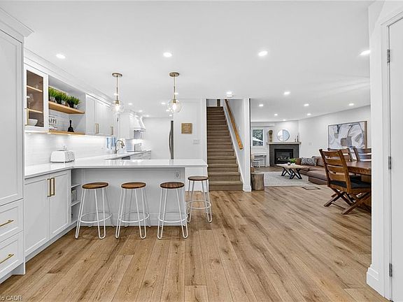 Move right in and enjoy this beautifully renovated 4-bedroom, 3.5-bath home, situated on a pie shape lot that expands to 71’ at the rear. Located in the heart of Hespeler and thoughtfully updated throughout, this home features a 2021 main floor renovation with luxury vinyl plank flooring, a vaulted ceiling, and custom built-in lockers in the foyer with shaker-style cabinetry and a natural wood bench. The kitchen is a dream for entertainers, showcasing extended shaker cabinets, quartz countertops, stainless steel appliances including a fridge, built-in GE Profile microwave/oven combo, induction cooktop (with gas hookup behind), and open wood shelving. A cozy sunken family room offers a gas fireplace and a shiplap feature wall. The powder room and laundry room were also updated, with quartz counters and backsplash. Upstairs, the primary bedroom includes a walk-in closet and updated 3-piece ensuite. Three additional bedrooms offer double closets and share a renovated main bath (2021) with a linen closet. The fully finished basement (2017) features wide plank laminate flooring, a built-in electric fireplace with stone surround and side storage, wet bar, and a modern 3-piece bath. Major upgrades include most windows (2018), front/bathroom windows (2021), new furnace and heat pump (2023), roof shingles (2018), and driveway resurfacing (2025). The home includes an owned hot water tank, water softener, hot tub (2013), and shed (2016). Located just minutes from sought after schools, Hespeler Village shops, dining, the library, W.G. Johnson Centre, Mill Pond Trail, parks, and Highway 401—this home combines style, comfort, and unbeatable convenience.