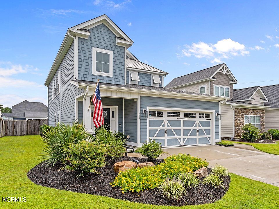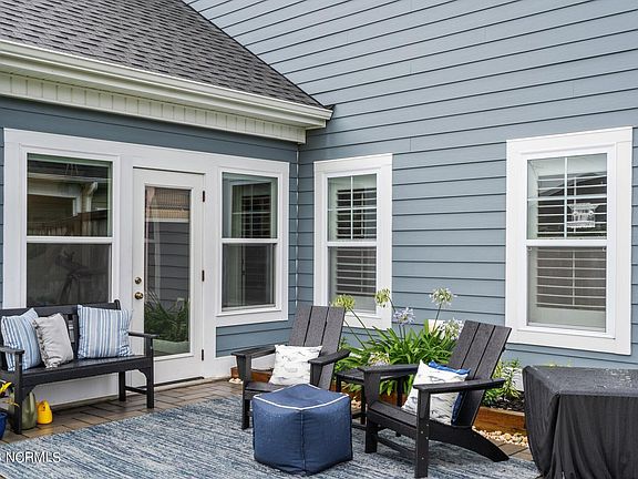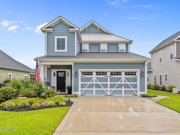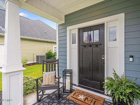 Located in the Cloverfield Park Section of Wyndwater, the Bournedale plan by Riptide Builders Sits on one of the larger lots only a short walk to the pool and clubhouse picnic area Finished with Hardie siding, & coastal inspired Bahama shutters give this home great curb appeal. This home impresses from the front door with its 2-story foyer, accent beams in the great room and cross coffered ceiling in the office. The large open dining space adjacent to the gourmet kitchen makes entertaining a breeze. The kitchen is finished with a large prep island, barn door pantry with whirpool stainless steel appliances. Enjoy an oversized master suite with walk in closet and ''spa'' bath featuring curbless entry shower and free standing tub. Additional upgrades include custom finished sunroom, custom wood shelving , in ceiling surround sound, Honeywell home security system Kinetico water softner system and many more. this home is HERS RESNET rated for energy efficient. 28 Evergreen is only 2 miles from the public ICW boat~ramp and in the coveted Topsail School District.