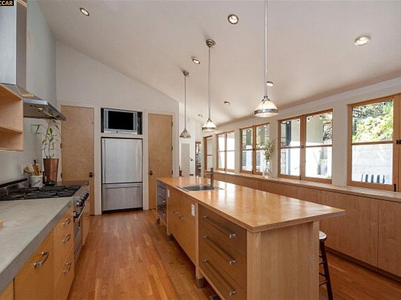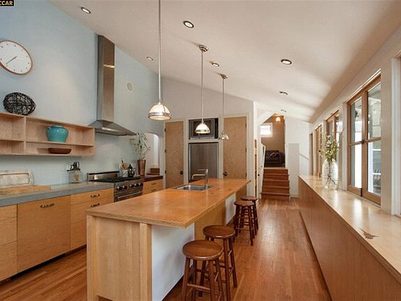 Berkeley Hills jewel with clean lines & modern functionality. Remodeled in 2005 by owner/architect, the home offers easy indoor/outdoor living. Includes an open eat-in gourmet kitchen, dramatic dining room w/doors to patio, warm living room, family room, office, bay views & terraced backyard garden.