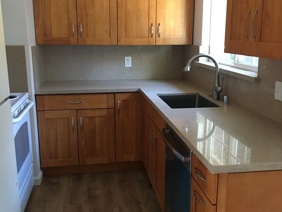 Total brand new kitchen! Includes brand new cabinets , quartz countertop, appliances , laminate floors We pay water , sewer and trash