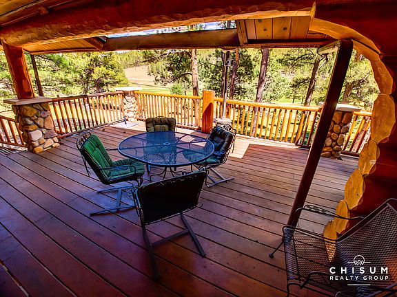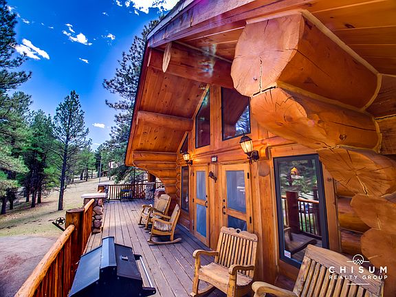 This log home is perfect for the discerning buyer who wants a one of a kind home on Angel Fire Resort's beautiful 18 hole Golf Course. Situated on a wooded lot that provides privacy and grants great views of the golf course and surrounding mountains from the oversized front porch, which is amazing for summer BBQs! Inside, you'll find a beautifully crafted log home with incredible attention to detail. The main floor features two master suites on both ends with en suite bath containing a large walk in closet, vaulted ceilings and tiled shower. The great room is impressive with massive wood beams, a large wood burning fireplace and beautiful hardwood floors. The kitchen has plenty of storage via the solid wood cabinets and has an enormous island with ample prep space, seating and a built-in range. The lower level has a second living area with bar, fireplace and patio doors leading outside. Another bedroom suite, bunk room, bathroom and laundry room can also be found on the lower level. This home comes fully furnished and ready to enjoy.