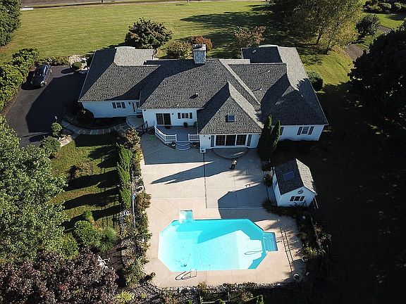 Homeowners have relocated! Stunning curb appeal, the front of the home faces south and all you see open space and farms. The 3,000 sq' white stone front ranch on 1.25 acres features a large pool and patio that has a pool shed for your beverages. A large patio surrounds the pool and a asphalt basketball sits nearby.Opening the front door you can see the swimming pool through the over sized Great Room 22' X 24' with vaulted ceilings, skylight, fireplace and a 12' of sliding doors. To the East Wing from the entry Foyer is the cherry wood floor Living Room and the parquet wood floor Dining Room. Which features a granite countertop opening to the Kitchen that makes social gatherings more comfortable.