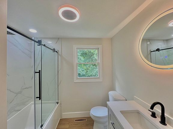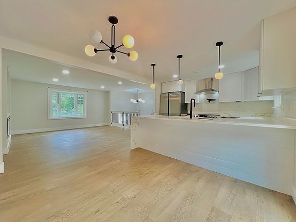 Nestled in a serene private cul-de-sac, this newly renovated home features an open floor plan that enhances its spacious, airy interior flooded with natural light. It boasts three generous bedrooms and two fully renovated baths, complemented by central air for year-round comfort. The heart of the home is its stylish U-shaped kitchen, complete with quartz countertops, new cabinets, and state-of-the-art appliances, including a sliding glass door that opens onto a large deck and expansive yard. Adding to its appeal are an inviting electric fireplace, fresh paint, new lighting fixtures, and luxury LVT flooring throughout. The garage provides ample storage, completing the blend of convenience and modern charm this home offers. This home combines convenience with contemporary living, making it a must-see opportunity for anyone seeking modern elegance and comfort.