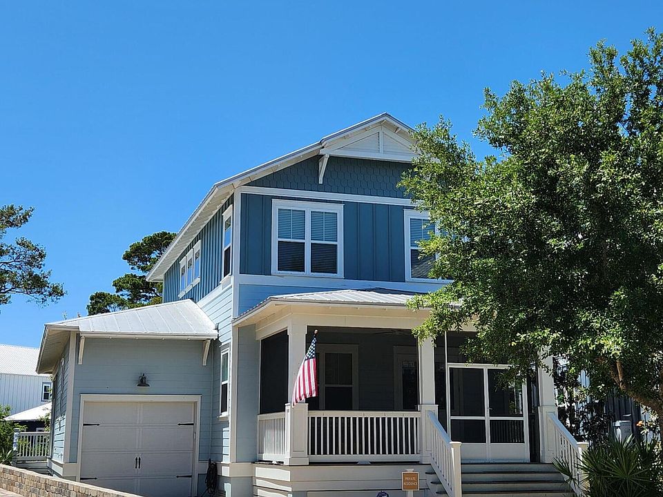 This freshly painted 4 Bed, 3 1/2 Bath beauty has new flooring and 2 new AC units! Enjoy the HUGE driveway, enough for 5 cars to park! Upgraded features: Crown molding, wainscoting, and a huge paver patio in the back! Enjoy starry nights in the hot tub, located on the screened-in deck. Kitchen has stainless appliances, gorgeous quartz counters, pantry and lots of cabinets. Safety features: hurricane-rated windows, concrete-filled cinder block foundation, 5-V Crimp metal roof, and closed cell insulation, sealing the home from underneath. Unique plan with 1st floor primary bedroom suite, and second one upstairs! Community pool area features hot tub, gas fire pit, pavilion with kitchen/grills, outdoor shower, etc. Near Blue Mountain Beach!
