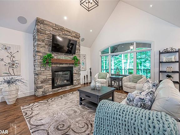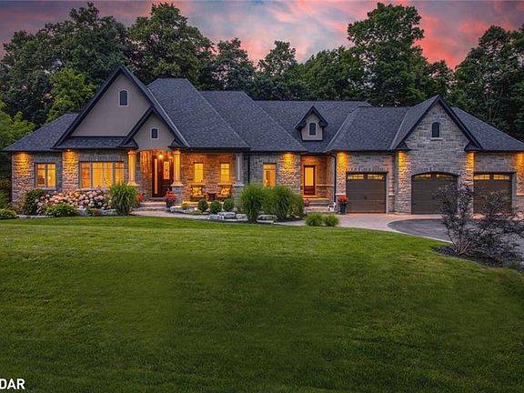 EXPERIENCE LUXURY LIVING IN A CUSTOM-BUILT OASIS MINUTES FROM ADVENTURE AND TRANQUILITY! Welcome to your luxury haven, minutes from Barrie's amenities and Snow Valley's adventures. This custom-built walk-out bungalow offers over 5000 sq. ft. of exceptional living space on a beautifully manicured half-acre property backing onto protected land w/ scenic trails. The grand foyer w/ cathedral ceilings sets an elegant tone. The main level features engineered hardwood, tile flooring, tray and cathedral style ceilings, and a chef-inspired kitchen w/ a tiled backsplash, pot and pan filler, heated floors, a 36" gas stove, high-end Jennair appliances, a butler's pantry, and a coffee/tea station. The oversized breakfast island is perfect for casual dining. The one-year-old lower kitchen mirrors this excellence w/ newer appliances, a large breakfast island, and an abundance of natural light. The professionally finished walk-out basement is ideal for multi-generational living, offering two bedrooms, two full bathrooms, a spacious living and dining area, a chef-style kitchen, separate laundry, and a flex space for an office, gym, or play area. Enjoy movie nights w/ the built-in 5.1 home theatre system w/ a projector rough-in. Relax in the one-year-old hot tub or entertain on the massive 350sq’ exterior deck. The large triple car insulated and heated garage, equipped w/ built-in speakers and inside entry, provides ample storage. Additional features include LED lighting, solid wood doors, 9' ceilings on both levels, and in-floor radiant heating throughout the basement and garage. The home also boasts two full laundry rooms, two stoves, two fridges, two washers, two dryers, two dishwashers, two laundry sinks, a large cold room/cantina for extra storage, and a 200 amp panel w/ surge protection. This remarkable residence offers luxury, privacy, and convenience, w/ an ideal setup for in-law capability and a layout perfect for entertaining and everyday living. #HomeToStay