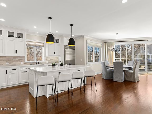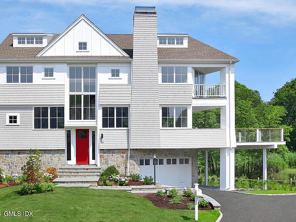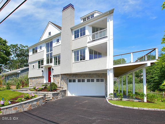Exceptional, south of the village five-bedroom Contemporary boasts stunning water views of Greenwich Cove; fabulous composite deck overlooking tidal pond and private master suite deck. Within walking distance to trains, school and beach. This like-new home features 4'' white oak floors, high ceilings and steel /cable railings. Provides wonderful indoor/outdoor living and entertaining in open floor plan with sleek quartz-clad kitchen, breakfast and family room with gas fireplace and cozy living room. Office, powder room and walk-in pantry complete main floor. Master suite with spa bath, walk-in closet; two bedrooms, Jack/Jill bath and laundry comprise second level. Top floor offers two bedrooms and full bath. With lower level gym, attached garage and access to level yard.
