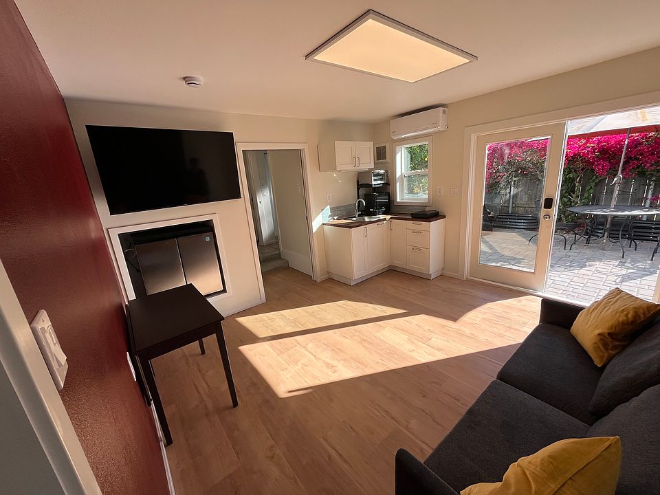 Furnished Berkeley Studio with Private Patio Newly constructed, fully furnished studio in-law, with private entrance and patio on quiet street in Westbrae Berkeley. Studio has great light, especially in the afternoon. It is small (main room is 13'x13'), but efficiently designed to maximize space with a murphy bed and custom storage options. Easy street parking. 1 tenant only please. Unit Amenities - Eco-home: 100% electric, solar energy - High quality air filter & in-line water filter - High-efficiency HVAC (heat & AC) - Laundry on premises (included in Utilities) - Private, fenced patio (fencing not shown in photos) - Interior, secure bike storage - Street parking - On-site management - Fully furnished with - Murphy bed & mattress - Couch - Desk & desk chair - TV - Storage - Kitchenette - Refrigerator/Freezer - Microwave - Toaster oven - Induction cook top - Pots, pans, utensils, dishware Neighborhood Amenities - Safe, quiet street near Hopkins, Sacramento and Gilman - Steps from Monterey Market, Gioia pizzeria, Hopkins Bakery, Cafe Roma - 10 minute walk to Headlands Brewing Transportation Options - 10 minute walk to North Berkeley BART - Steps from AC Transit Bus 12 - 15 minute bike to UC Berkeley Campus - Street parking Total Utilities (additional $125/month) - High-speed internet - Streaming services: Max, YouTube TV, Netflix, Peacock - Water - Garbage, recycling, compost - Electricity - Laundry (in garage) About Us We're an environmentally conscious family of three in the main house attached to this Junior ADU. I'm on staff at UC Berkeley and my partner works for StopWaste (Alameda county's waste management authority). We have a 10 year old who goes to elementary school locally. Lease Terms 12 month lease 9 month lease Flexible/Other lease Option To Renew 12 month. Single occupancy only please.