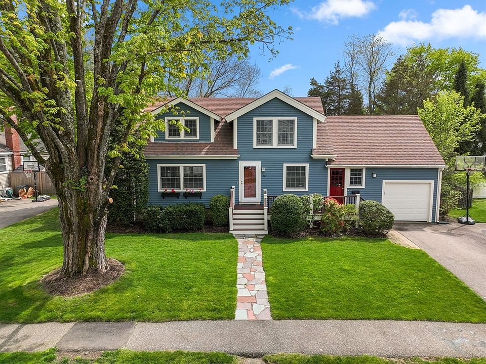 Located in a delightful neighborhood, close to Needham Center & Wellesley Hills, this expanded & remodeled Cape style home, features 3 bedrooms/3 full baths. The seller carefully & thoughtfully opened up the living space on both levels, creating a more contemporary & functional layout. The modern kitchen is adorned w/granite countertops, breakfast bar peninsula & stainless steel appliances & is adjacent to both the spacious living & dining rooms. The sun drenched living room has multiple built-ins & shelving, a wood burning fireplace & plentiful windows. The mudroom is home to pantry storage, a full bath & access to a large rear deck & fenced-in southeast-facing backyard. The 2nd level houses the primary suite w/cathedral ceiling & elegant bath, 2 additional spacious BRs, guest bath & 2 linen closets. The partially finished lower level is versatile, providing extra office, playroom and/or guest room space. Central AC, prof. landscaping, yard shed & garage pkg make this a must see!