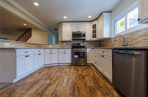 Totally renovated home. Unpack your bags and enjoy it. 5 Bedrooms and 2 full baths. Open area layout with kitchen flowing to huge family/living room. Beautiful white custom kitchen with granite countertop. All new ss appliances. Central Air/Heating all brand new, paved patio and driveway, private backyard with a shed.