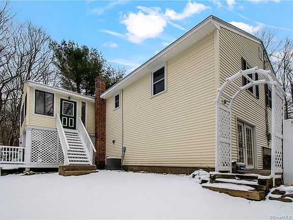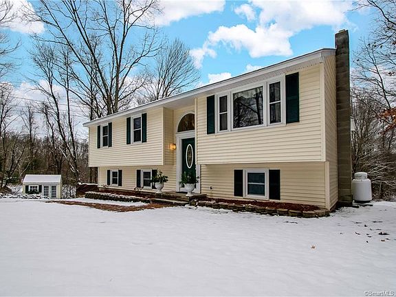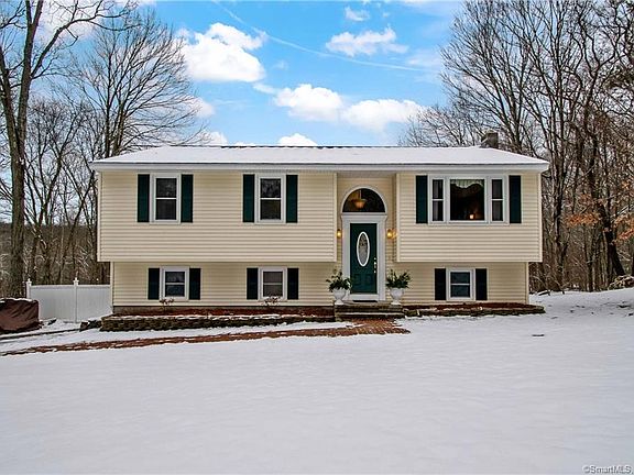 The custom kitchen is truly the heart of this home! Timeless off-white cabinets w/ a few elegant glass doors, granite counters, high-end SS appliances, & tasteful design elements by a culinary professional. Over-sized peninsula w/4 stools & pendant lighting. A glass lookout above the kitchen sink provides natural light. The four-season room addition off the dining room is part of the home all year-round, warmed by a woodstove. Underneath is a covered deck offering more outdoor entertaining space. A custom stone patio & fire pit surrounded by beautiful professional landscaping was recently built. A truly spectacular use of the scenery with natural materials adding to the country vibe. There are 3 bedrooms on the main level and a 4th bedroom/guest suite on the lower level. Each floor has a full bath. The lower level has a family room with authentic barn boards on the walls for a rustic farmhouse feel and a 2nd woodstove. Newer heating/central air system. This home shows the pride of ownership. Current owners did an outstanding job maintaining their home over the years, such as replacing windows, vinyl siding & the roof. Very clean inside & out. Useful garden shed next to the paved driveway. 1-car under garage is currently being used as a workshop, but can be converted back with an overhead door. Enjoy the country scenery on this dirt road. Walking distance to the 138-acre Royal Knowlton Preserve w/Spur Trail. Less than 5 miles to Uconn's Campus & Storrs Downtown Partnership.