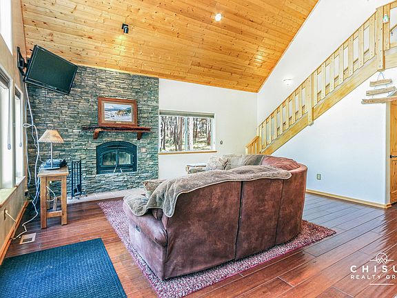 This low maintenance, stucco sided home built in 2005 is situated on a wooded, level lot, only a few blocks from Monte Verde Lake. It has a large front deck, covered tree stand and a detached one car garage. Inside you'll find an open concept great room with vaulted tongue and groove wood ceilings, hardwood flooring, a large window wall and a stunning stacked stone fireplace. The kitchen features wood cabinets, tile flooring and countertops with a travertine tile backsplash. On the main floor you'll also find two guest bedrooms and a full bathroom. Upstairs features a loft with sitting area and the master bedroom with private deck and ensuite bath. All bathrooms have tile flooring, countertops and bath surround. The home also has solid knotty pine wood doors throughout, adding a nice rustic feel. Well maintained, fully furnished, and move in ready for the next family to enjoy. Call us to take a tour!