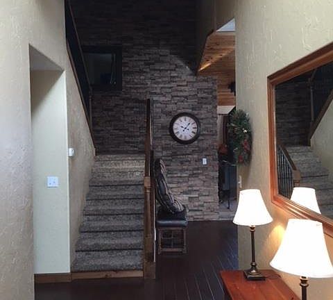 FANTASTIC PANORAMIC VIEWS FROM THIS BEAUTIFULLY UPDATED HOME CLOSE TO TOWN. COMPLETELY REMODELED OPEN KITCHEN, DINING & LIVING ROOM INCLS CUSTOM WALNUT KITCHEN CABINETS, GRANITE COUNTER TOPS, EATING BAR, STAINLESS STEEL APPLIANCES, 5" HICKORY ENGINEERED WOOD FLOORS, WRAP AROUND STACKED STONE WALL W/WOOD STOVE, VAULTED CEDAR WOOD CEILINGS IN LIVING AND DINING RMS, AND DK OAK & IRON RAILINGS. TILED JETTED TUB IN MASTER BATH. 700 SQ FT REC ROOM IS NEW ADDN TO HOME. STAMPED CONCRETE PATIO & BLT IN FIRE PIT