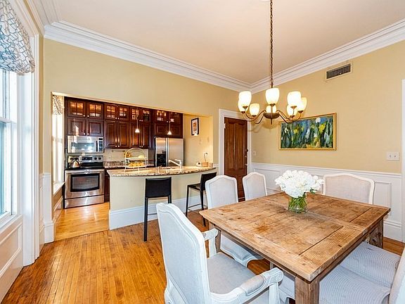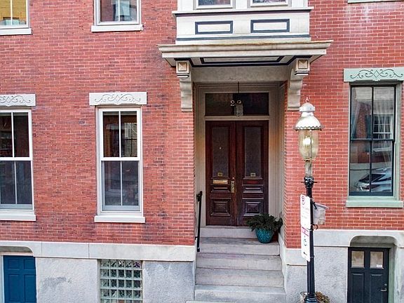 Desirable Monument Avenue with gas lights, this Penthouse condo is in a great location. This duplex, renovated brownstone home offers three bedrooms. The dining room with a marble mantle, and the granite kitchen with a breakfast bar, provides gracious entertaining, with sunset skies from three windows. Entrance to the living room through the butlers pantry with beverage cooler and granite counter. The living room with a marble mantle and built in shelving and an office with a bay window seat overlook scenic Monument Avenue. The carved staircase area, includes a closet, and powder room with a washer and dryer. The Master bedroom with two large windows, has a walk-in closet, and a Restoration Hardware Carrera marble bathroom. The other two bedrooms face Monument Avenue. A second full tiled bathroom with a tub/shower. Carved staircase to a private roof deck with expansive views of the city skyline and Bunker Hill monument. AC. California closets throughout. Rental garage parking available