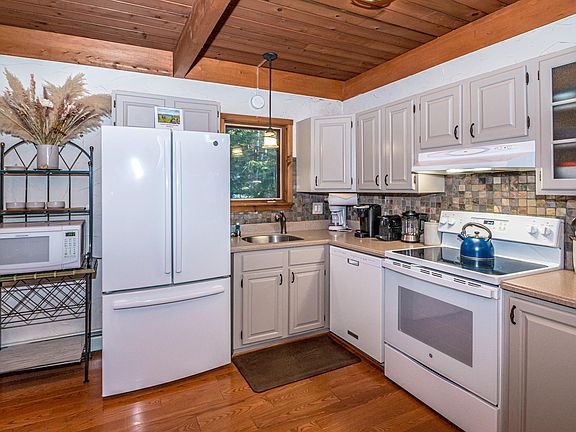 Welcome to this delightful home offering stunning Mount Washington views! Set on 1.4 acres in the quaint town of Jackson, NH, this property features interior finishes that bring the feel of nature indoors. You will appreciate the beautiful wood floors and the striking fieldstone fireplace with a woodstove insert, perfect for warming up on cold days. The open staircase adds a rustic yet natural warmth to the design, gently flowing into the kitchen, dining, and living areas. This space offers direct access to a spacious deck, ideal for taking in the breathtaking Mt Washington view. The first level also includes a sunroom with a hot tub - a perfect place to relax after a day on the slopes. Upstairs, the primary bedroom enjoys a wonderful view, along with two additional bedrooms and a nicely finished 3/4 bath with a walk-in shower. The lower level offers additional charm with a finished family room, a convenient half bath, a foyer with a gas log stove. The two-car garage provides ample storage above for all your gear. Enjoy the best of New Hampshire living near Jackson's quaint village, Jackson Ski Touring Cross Country Trails, and nearby ski areas including Black Mountain, Wildcat, Cranmore, Bretton Woods, and Attitash. The property is also close to the National Forest for hiking. Great opportunity at a Great Price! This home is the perfect primary residence or vacation retreat in the Mount Washington Valley.