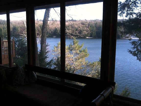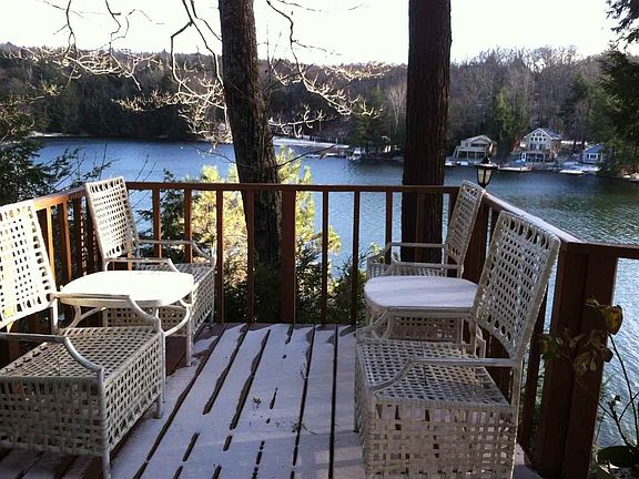 Waterfront home perched above the lake. Lakeside 2 stories of windows for full lake view. 1st floor all purpose room has wet bar, gas FP. LR w/ wood FP. Formal and informal dining areas. Main bedroom has whirlpool bath. Walkout lower level has full bar with stove and refrigerator, wood fireplace, sauna. Lge room was billiard room and craft room. Second living space possible. Located on private, non-gas motor lake that is perfect for swimming, paddling and fishing. Many activities both summer and winter.