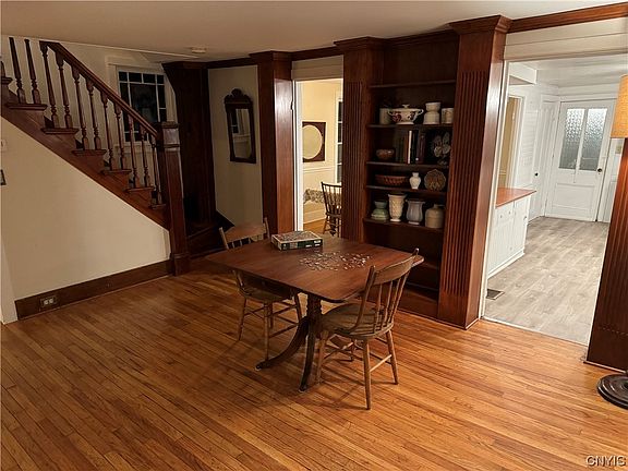 Welcome to Cazenovia! 26 Nelson St. is centrally located with easy walkability to village, lake and shopping. Enjoy all the area has to offer, outstanding restaurants, award-winning school district, charming shops, 4-season recreation, the list goes on! This home retains many original details while offering comfort and peace of mind with updated roof, furnace, hot water heater, central AC, and fully renovated bathrooms. The living room is warm and cozy with hardwood flooring, wood trim and the beautiful original staircase. Renovated half bath on first floor is convenient for guests. The large kitchen with adjacent dining room is ready for your customization, bring that Pinterest board to life! Use the back staircase off of the kitchen to sneak upstairs to relax in the primary bedroom with additional dressing area or soak in the clawfoot tub. Two additional bedrooms and another updated full bath complete the upstairs. First floor mudroom/laundry room is a spacious and flexible space. Detached 2-car garage provides ample storage. Move right in and enjoy!