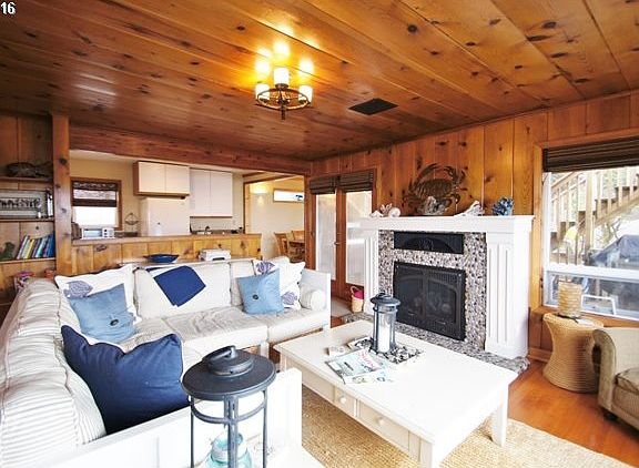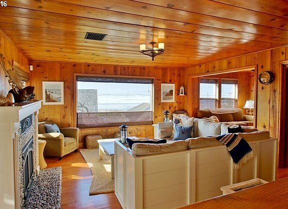 Delight in ocean views from every room. Tucked just back & elevated up from the ocean front this charming & comfortable 2,139 sf home offers spaces for everyone to gather or hideaway. Stand-outs include: fir floors, one-of-a-kind stone fireplace, granite countertops, warm knotty pine walls, built-in window seats, skylights, and storage galore. Outdoors discover both covered & open viewing decks with the beach literally steps away.