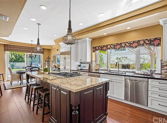 Beautifully upgraded 5 bedroom + office home nestled on a quiet cul-de-sac in the highly sought-after Greens tract. Unique circular driveway & gorgeously manicured landscaping leads to double door entry w/ grand foyer overlooking the living room w/ two-story ceilings, fireplace & expansive windows. Open concept family room w/ fireplace provides stunning views of the backyard. Renovated kitchen showcases granite & quartzite countertops, Viking 6 burner cooktop, double ovens, double dishwashers, built-in drawer microwave, center island w/ counter height seating, wet bar w/ authentic red wine barrel sink & wine fridge. Laundry room features integrated storage, mud room, new tile flooring & granite countertops. Downstairs guest suite w/ private bath and an expansive office complete the lower level. Spacious master suite w/ private sitting area, fireplace & balcony. Spa-like master bath w/ new woodgrain tile flooring, his & hers sinks w/ vanity, baroque mosaic tile in oversized shower, freestanding bathtub set among pebble garden, arabesque chandelier, dual walk-in closets, LED lighting & updated fixtures. 3 additional bedrooms & 2 additional bathrooms complete the upper level. Entertainer's dream backyard features saltwater pool, BBQ island w/ bar seating, custom lighting & tranquil courtyard. Additional upgrades include hardwood flooring, smart thermostat, whole house fan, speaker system, Ring doorbell, LED patio lighting, maintenance free fencing & built-in storage throughout.