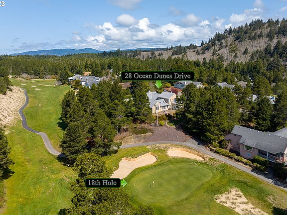 Golfers Dream! Meticulously maintained 4,000 sq home over looking 18th green at Ocean Dunes Golf Links. This beautiful home features Gourmet Kitchen, granite counters, custom cabinets, SS appliances, 6 burner gas stove & pantry, open concept Living room/dining area with double sided fireplace & 16 ft ceilings. French doors in Family room open out to the patio. 2 primary suites, Main level suite has nice size walk in closet, granite counters, double sinks, tile walk in shower & jetted tub. Upstairs Primary suite has fabulous balcony with golf course views, walk in closest and attached bathroom with walk in shower. Spacious 3rd bedroom with adjoining bathroom. Downstairs: Home Theater with New upgraded premium projector, surround sound, 9 comfy recliners, & popcorn machine. Private office/den with fiber internet. New furnace, Central Vac and Anderson windows. Manicured yard, Fully fenced backyard with extra wooded lot, only steps from the 1st Tee & walking trails. Just minutes from Ocean, Beaches and Old Town.