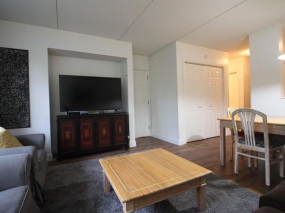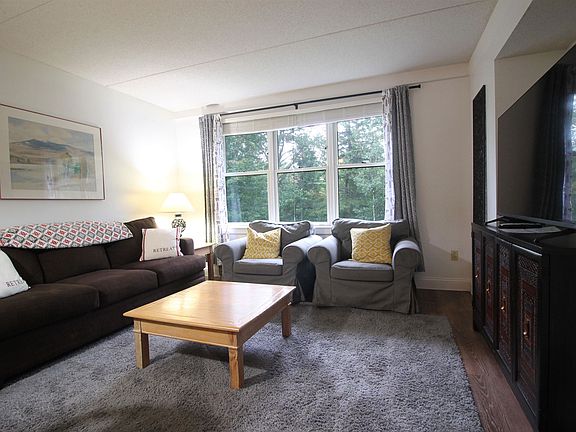 Rare find in the Golden Eagle Lodge! This condo is conveniently located and offers a larger than usual floorplan with 2 big bedrooms and 2 full bathrooms...with one of them being inside the master bedroom creating a perfect master suite. Entering the condo you'll find a galley style kitchen which is connected to the dining area and living room that offers a nice private view. All of the flooring has been replaced with beautiful vinyl plank which is super durable and has a lifetime warranty. Just off the living room you'll find bedroom 2 which easily fits 2 twin beds. The owner has cleverly added a bench/storage area which can be used as additional sleeping space. At the end of the hallway you'll find a HUGE master suite complete with a large walk-in closet and attached bathroom which is perfect for privacy. The Golden Eagle Lodge has an on-site rental program for easy rental income to subsidize costs. Many other amenities include on-site property management, indoor pool, 2 hot tubs, sauna's, indoor storage, coin-op laundry, outdoor patio with grills, playground and more. CABLE AND INTERNET IS INCLUDED with the condo fee which is a nice savings. The location in Waterville Valley is ideal with Town Square, Corcoran's Pond, Athletic Club and all restaurants just a short walk away. (sorry, pets are not allowed in the GEL). White Mt. Athletic Club membership can be transferred for a $750 transfer fee. Property comes with EVERYTHING included, all it needs is you!
