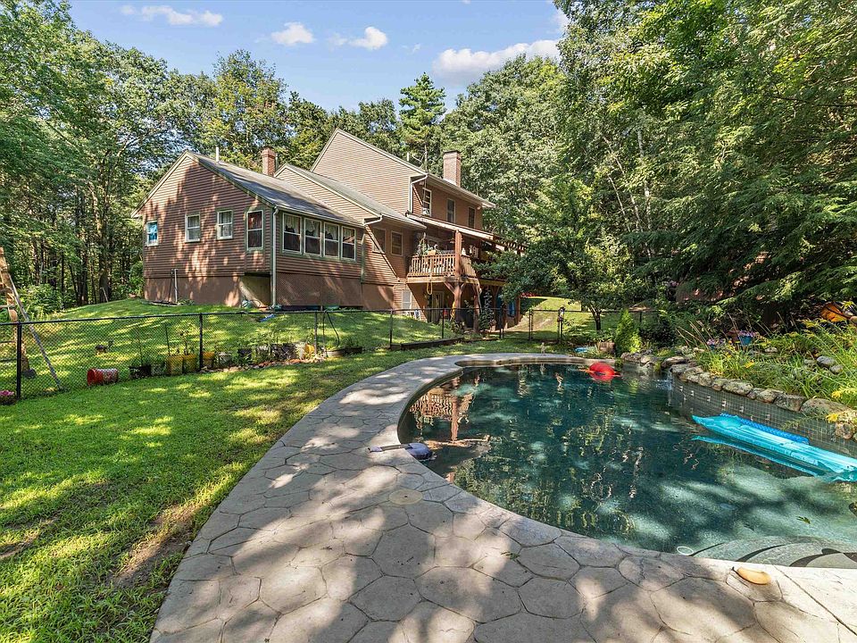 Amazing price for this incredible property situated on a 14.58 acre lot! This Rustic Cape Cod style home features a floor plan for multiple generations. Featuring 3 levels of living space with 4 bedrooms and 3.5 baths. Kitchen/Living Room with a stone fireplace, making it a perfect place for gatherings. Vaulted ceiling family room with a wood stove, dining room and 2 bedrooms which includes the private master suite with a sitting room and full bath. Upstairs you'll find 2 additional bedrooms with built in wall units and a full bath. Walk out lower level with another wood stove and 3/4 bath, pool table and workshop. Outdoors you'll be impressed by the 28 ft covered porch overlooking the Gunite pool with a waterfall and peaceful surroundings. Situated right off 121A for easy commuting and access to area amenities, this home is a must see.