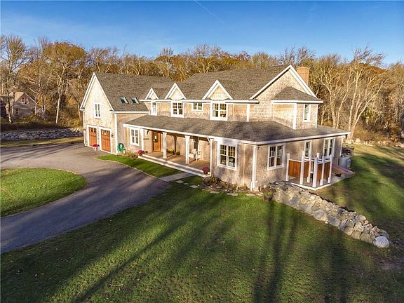 Little Compton, RI - Custom designed and built residence on ~3 acres located at the end of long private drive w/ beautiful rambling stone walls, bordered by a trout stream, a horse farm, conservation land on the northern tip of Quicksand Pond & accessible by path. The home features an open first floor plan through which long views down the foyer, to the large bluestone fireplace in the sunken great room, & across the kitchen to the dining room, accented by wide plank walnut flooring & coffered ceilings. The kitchen features custom cabinetry, granite counters, pantry & dry bar. The sun drenched dining area is located off the kitchen w/ access to the expansive decks, patio & yard. The first floor also includes 2 studies, 1/2 bath, mudroom & pantry. The second floor offers 2 guest bedrooms, laundry & a beautiful master suite. All of the bedrooms have sound insulation for ultimate privacy. The master suite offers a private bath w/ steam shower, soaking tub & full walk-in closet. Separate 1 bedroom in-law suite located above the garage is accessible from main house & contains all amenities, laundry & a private deck overlooking the back yard to the stream. Front porch & expansive rear decks are among features that provide ample outdoor living opportunities. The home offers Geothermal Heat and A/C, Whole House Generator, Oversized 2 Car Garage w/ workshop & Outdoor Shower. Located just minutes from nearby Acoaxet, Beaches, Town Commons & Adamsville Village. Minutes to Highway.