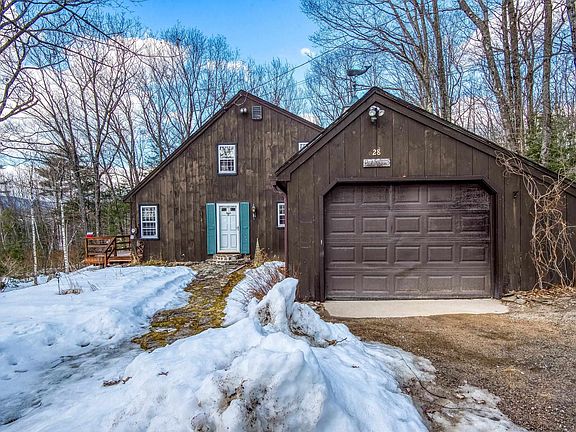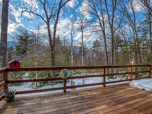 Western Mountain Views! Best value for a home in North Conway. This 3-bedroom, 2 bath Birch Hill home with a 1+ car garage on a 1-acre lot is in need of cosmetic updates. The living room features a massive granite fireplace, cathedral ceilings, and exposed beams. Main level bedroom with large windows and a woodstove overlooks the Moat Mountains. An extra-large family room in the lower level offers space to watch the big game. Complete with central A/C and a lovely yard. Bring your imagination, ambition, and build equity.