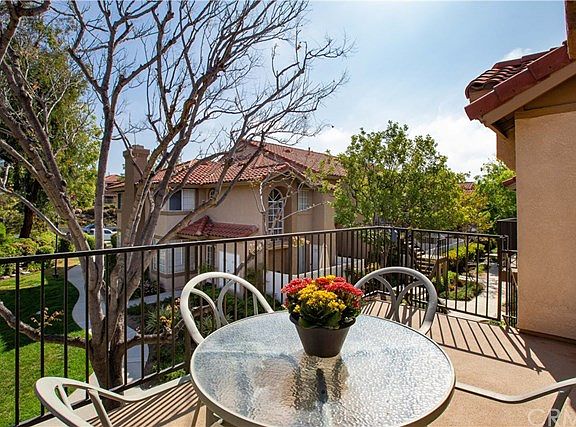 Enjoy the sunrise/sunset right off this exceptional end unit with VIEW of gorgeous mature trees, greenbelt and Saddleback mountains. This highly sought-after one-level living unit with no one above or below provides much privacy for entertaining with 2 large balconies off the living room as well as the master bedroom. Outstanding floorplan with vaulted ceiling and ample natural light! Recent upgrades include warm designer paint, new Quartz countertop, new stainless steel stove, dishwasher, oven, microwave, sink, toilets, and fixtures. Kitchen has been refaced with new Shaker doors and a fresh coat of crisp white paint and new knobs. Wood flooring in living room, hallway and both bedrooms. Beautiful 16 by 16 tiles in kitchen and both bathrooms. Master bath with soaking tub has been re-glazed and looks brand new. New fixtures throughout and front door is freshly painted. AC and furnace were replaced in 2014. Ceiling fan in dining room. One car detached garage just right below the unit and two additional parking passes. The community offers a pool, spa, tot lot. The Santa Margarita Lake and Beach Club are located within steps! Within a mile radius, there is shopping, restaurants, neighborhood schools, and toll roads. Total HOA dues is only $275 a month! No Mello Roos. FHA & VA approved complex! Seller is putting in BRAND NEW DOUBLE-PANED WINDOWS!