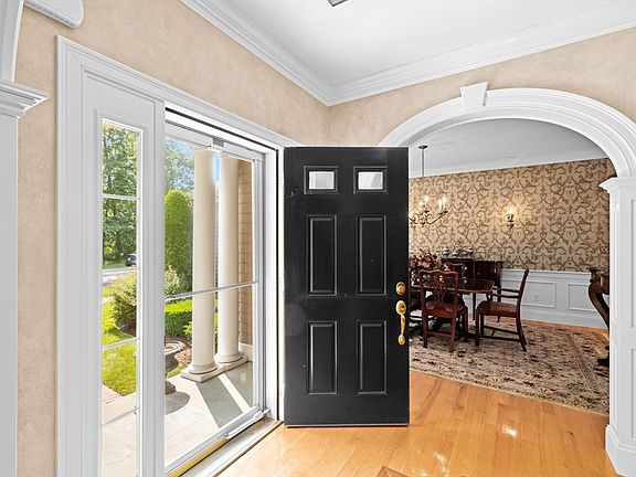 This stunning custom- built home offers a combination of luxury & privacy. Set amidst serene tree-lined views, the home welcomes you through a gracious foyer with detailed wood floors. The open floor plan boasts a spacious living area with cathedral ceiling, creating a light- filled & airy atmosphere. The chef's kitchen features a large center island, perfect for both cooking and entertaining, and flows seamlessly into the inviting living room with cozy gas fireplace, 2 sliding doors lead out to a private deck ideal for enjoying peaceful outdoor moments. Elegant dining room with an archway entrance, detailed molding & separate bar area. Lovely office with built in desk & shelves . Spacious 1st floor primary bedroom is a true retreat complete with large walk in closet & spa like full bath with double sinks, walk in shower & air tub. Walk out lower level has 2 large bedrooms with full windows, full bath & family room with 2 sliders out to a patio area. 2 car attached garage.
