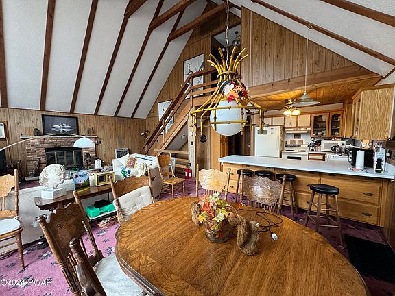 FULLY FURNISHED HOME AVAILABLE NOW with seasonal view of Roamingwood Lake. GREAT FAMILY HOME. Enjoy views from second tier deck off living room. 4 bedrooms & 3 full bathrooms. Primary bedroom has double closets and skylights. Features formal dining room and living room with wood burning fireplace. Lounge in the expansive lower level family room with patio doors to outside.DOG FRIENDLY with pet deposit. Minimum lease is 4 months up to one year. No smoking allowed inside. No cats. Tenant responsible for electric, propane, internet (anything above basic cable), and $425 Hideout security fee. Landlord will pay for sewer, water, garbage, and regular cable. Also included are the amenities badges. Fully equipped kitchen. FULLY FURNISHED.Must pay first rent and one month security. Upon agreement, $4200 to be paid.