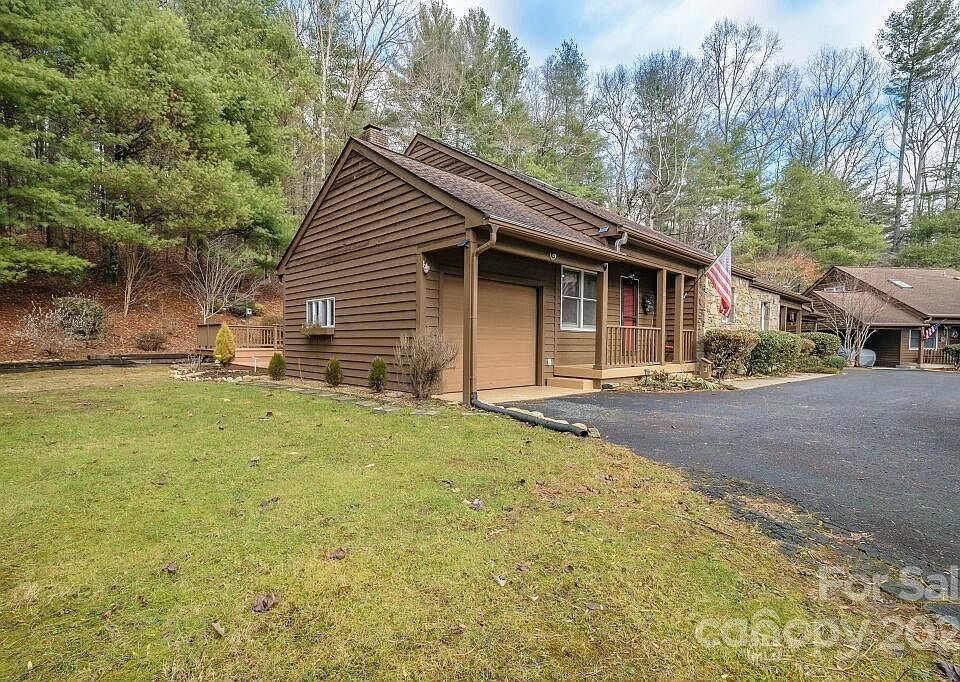 Beautiful updated and private End Unit Condo. Kitchen features pantry and updated Quartz counter tops. Like new hardwood floors throughout. Cozy living room with remote control gas log fireplace. Living room opening to private, large screened in porch and open deck overlooking park like setting. Home features one bedroom - one bathroom on main which could be used as primary or guest. Upstairs features spacious 21'3" x 12' primary bedroom suite. Upstairs area compliments the primary bedroom with beautiful bathroom and large closet space. New TRANE HVAC in 2018 with separate up-down thermostats ensures desired comfort. Unit is the only one in PhIII with an enclosed garage. Home has lots of storage area. Amenities include in ground Community Pool and walkable community. Nearby amenities include Etowah Valley Country Club, Cummings Cove Golf Course, Broadmoor CC, Pisgah Forrest, Dupont State Forest, grocery, bank, pharmacy and restaurants all minutes away. Immaculate and move in ready!