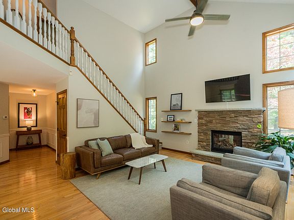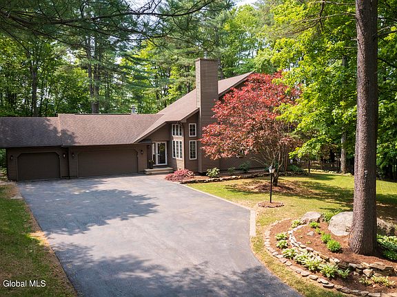 Located just 5.5 miles from Broadway in Saratoga Springs sits this updated contemporary gem. The 3 bedroom, 2.5 bath home is nestled on a parklike 1.43 acre lot. Features include a spacious first floor primary suite, beautiful three season room, spacious kitchen with Kraftmaid cabinetry and stainless steel appliances. Living room boasts a vaulted ceiling, hardwood floors and gas fireplace with stone surround. Upstairs has new carpet, two bedrooms with adjoining full bath and a great loft area - perfect for working from home. Basement has good ceiling height and is a walk out. Andersen windows. 3 car attached garage plus 1 detached. Two sheds. Generator is negotiable. Ring doorbell in use. Seller prefers to close in August.