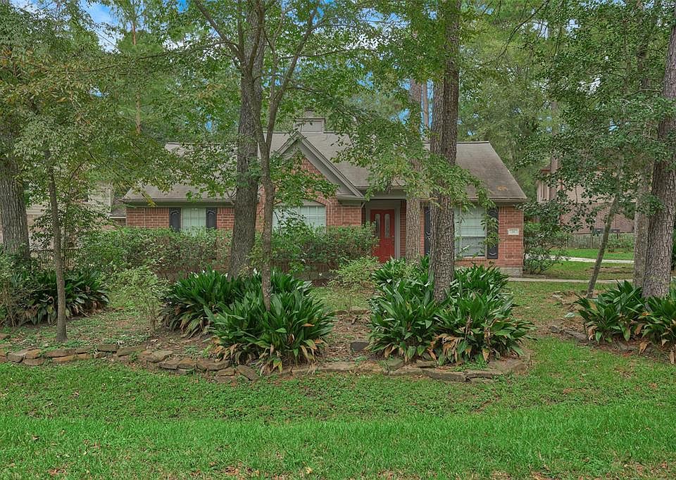 Fabulous updated single-story home in Panther Creek. Sought-after location w/quick, easy access to shopping, dining, entertainment, schools, as well as I-45, Woodlands Pkwy, Gosling & Kuykendahl. Spacious corner homesite w/mature trees, detached two-car garage. Brick w/shutters lends to overall curb appeal. Light wood-look tile floors throughout w/light warm gray walls, updated hanging fixtures lend to modern farmhouse ambiance. Study has French doors, built-ins, could be flex space for play/game room, exercise, hobby, music. Formal dining has eye-catching urban chandelier. Spacious family room has high ceiling, dramatic fireplace wall w/recessed ledges for plants/art/decor & built-ins. Kitchen is updated w/granite, white cabinets, black w/stainless steel appliances. Master bath has 2 vanities, granite, tumbled marble, corner soaking tub, walk-in shower w/frameless glass enclosure. Two secondary bedrooms share full bath. Back yard is large w/oak trees, patio area for grilling.