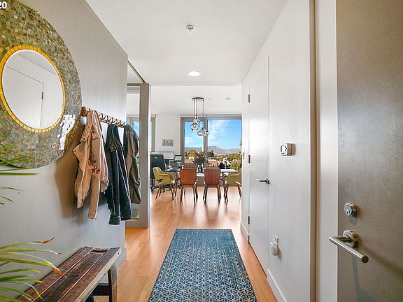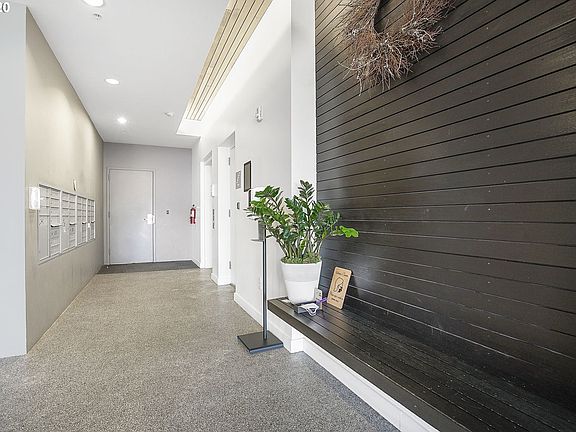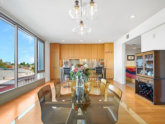 Stunning View! Bright condo in the heart of Restaurant Row in the vibrant Kerns neighborhood. Lives large with floor to ceiling windows, beautiful white oak floors, tons of natural light and spectacular views of downtown from this top floor gem! This home boasts SS countertops with built- in appliances, new fridge 2019, large island, soaking tub, and washer/dryer in unit. Parking in secure garage and extra storage space included. Walk to shops, coffee, art galleries, groceries and more!